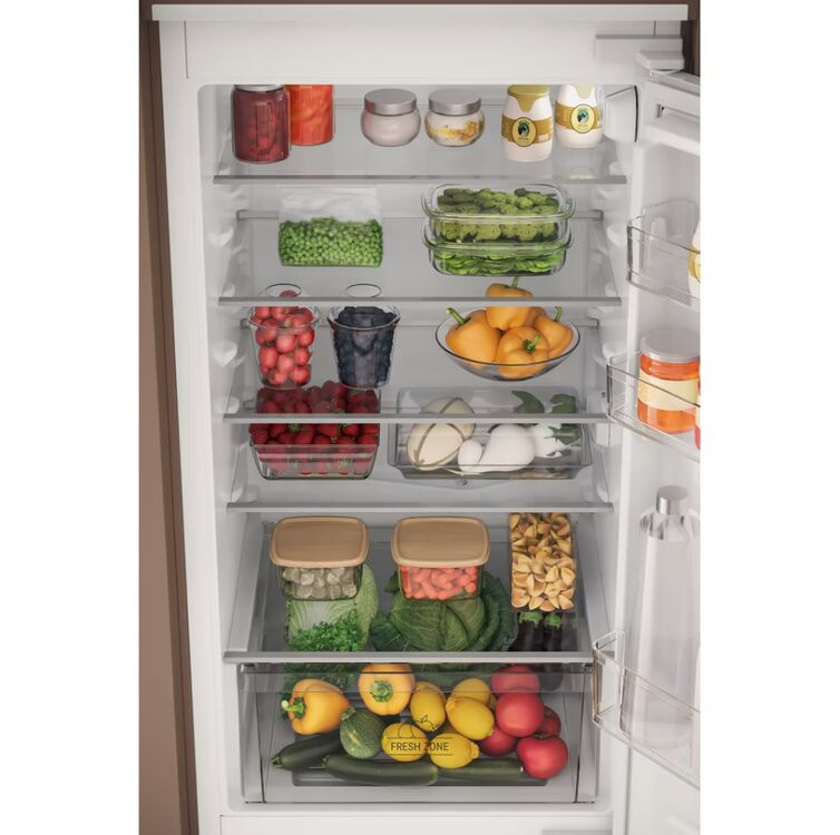 This Hotpoint built in Fridge Freezer features: white colour. Glass shelves, providing robustness. Convenient bottle balcony to safely store your bottles.