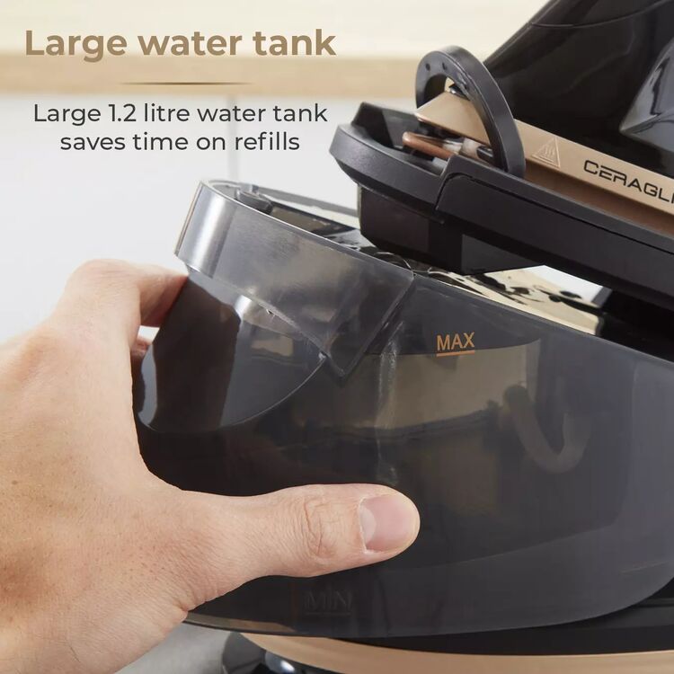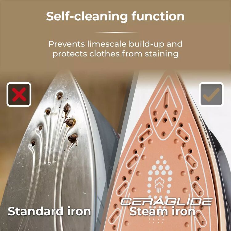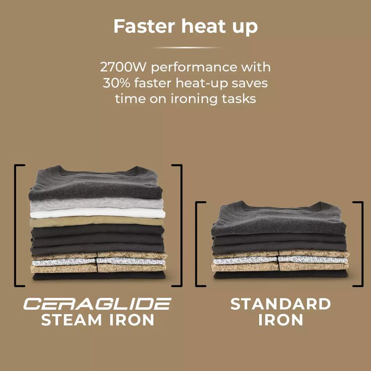 High-performance Ceraglide iron with a non-stick, scratch-resistant ceramic soleplate for an effortless glide across fabrics & 30% faster ironing.